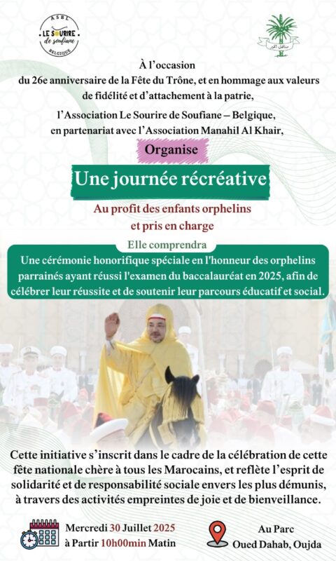 في أجواء يملؤها الاعتزاز بالوطن والولاء لجلالة الملك محمد السادس نصره الله، واحتفالًا بذكرى عيد العرش المجيد، نظّمت جمعية ابتسامة سفيان من بلجيكا، في أولى ثمار شراكتها الجديدة مع جمعية مناهل الخير بوجدة، خرجة ترفيهية متميزة لفائدة الأيتام والأرامل، يوم الأربعاء 30 يوليوز 2025، إلى فضاء واد الذهب، الذي يُعد من أبرز الفضاءات الترفيهية المتكاملة في المدينة.