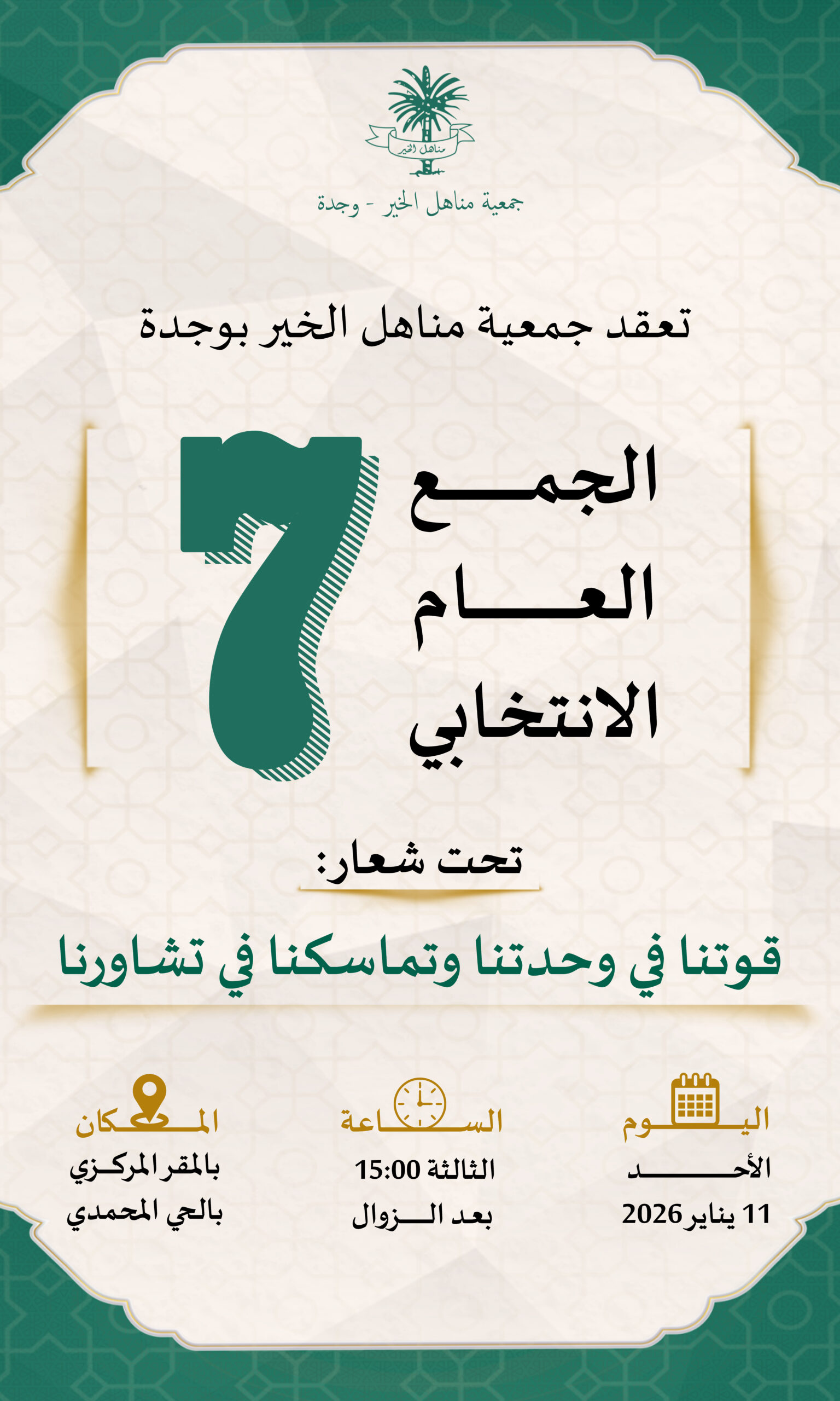تم بحمد الله وعونه انعقاد الجمع العام الانتخابي السابع للجمعية وذلك يوم الأحد 11 يناير 2025 على الساعة الثالثة مساءً، وذلك بمقر الجمعية المركزي الكائن بـ الحي المحمدي ، تجزئة البوهلالي، الزنقة 226 رقم 36 .